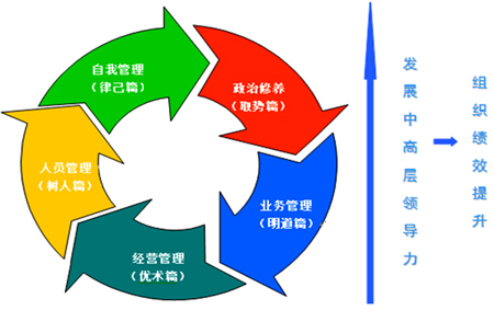 "领导力内容线"说明二:提升新任处级干部领导力遵循从以下五个维度进行为期五天的集中培训: